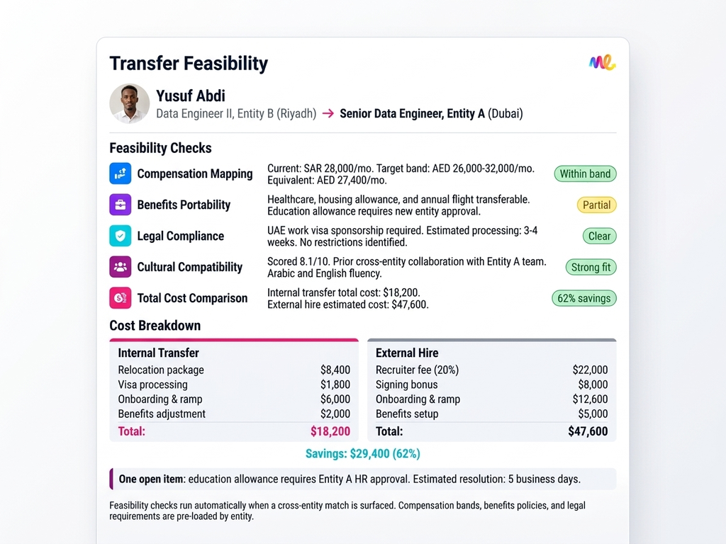 - The platform normalizes job architectures using rule-based mapping and NLP similarity detection. Compensation mapping compares current pay to target entity bands with configurable adjustment thresholds. Legal and visa compliance checks run automatically per jurisdiction pair.