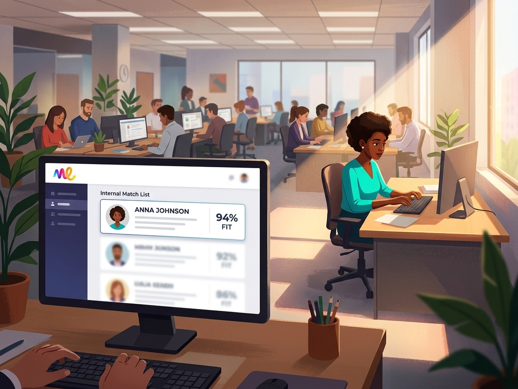 - Scores every employee against open requisitions across six dimensions. Surfaces candidates who qualify but would never have self-selected.