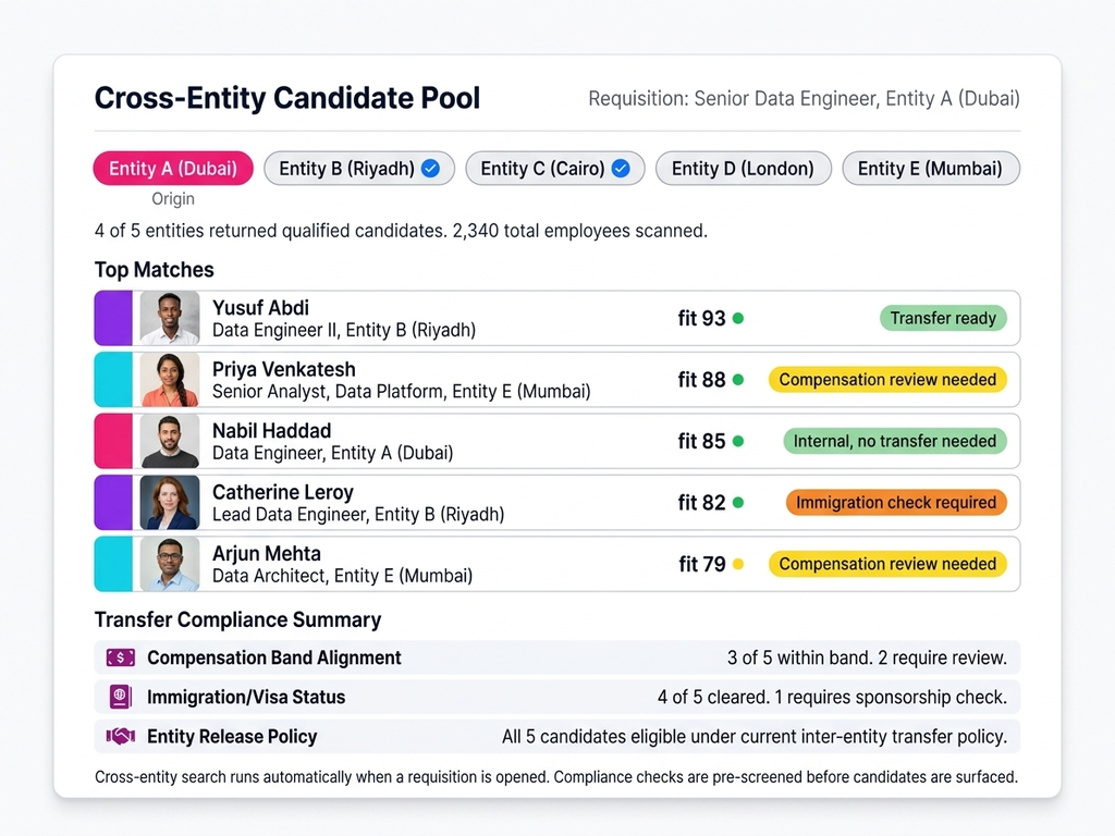- Normalizes job architectures across subsidiaries, maps compensation bands, and runs compliance checks to surface transfer-ready candidates in sister entities.