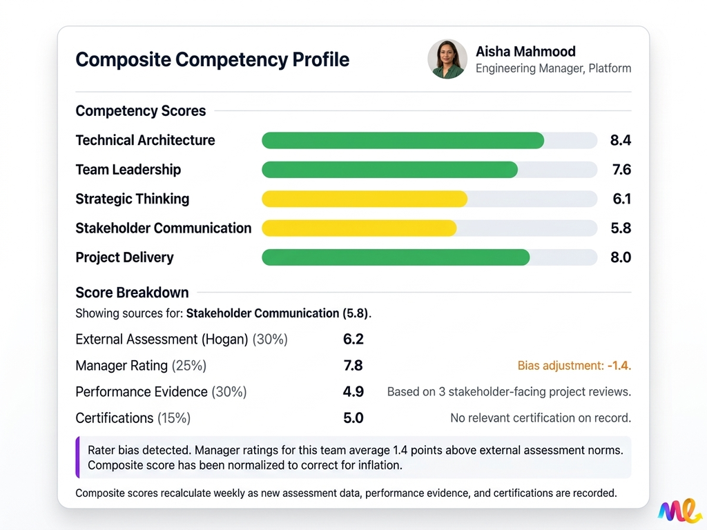 - Starts with whatever competency data exists, including basic self-assessments and job descriptions. Rules-based gap calculation works from day one. Statistical normalization activates at 6 months, ML predictions at 12. You need a digitized framework and one assessment source to begin.