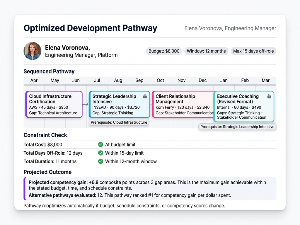 - Analyzes each employee's competency gaps, career goals, learning history, and schedule constraints. Sequences the most effective programs using constraint-satisfaction optimization. Each pathway shows duration, cost, milestones, and links directly to LMS enrollment.
