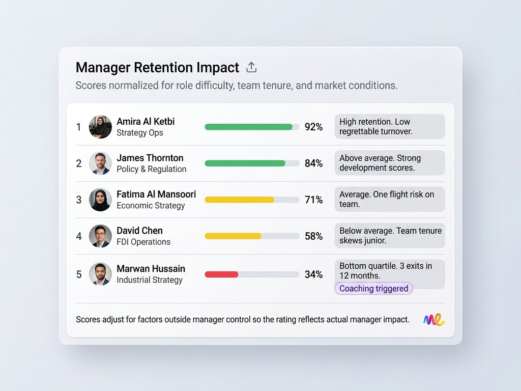 - Quantifies each manager's retention impact with context-adjusted scorecards. Separates inherited turnover from turnover the manager generated.