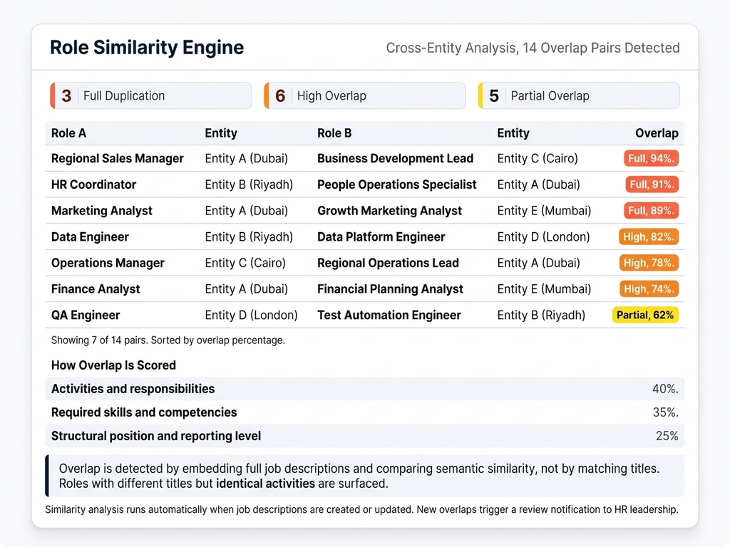 - Compares job descriptions, activities, and skills across entities using semantic analysis. Surfaces overlap that title matching misses entirely.