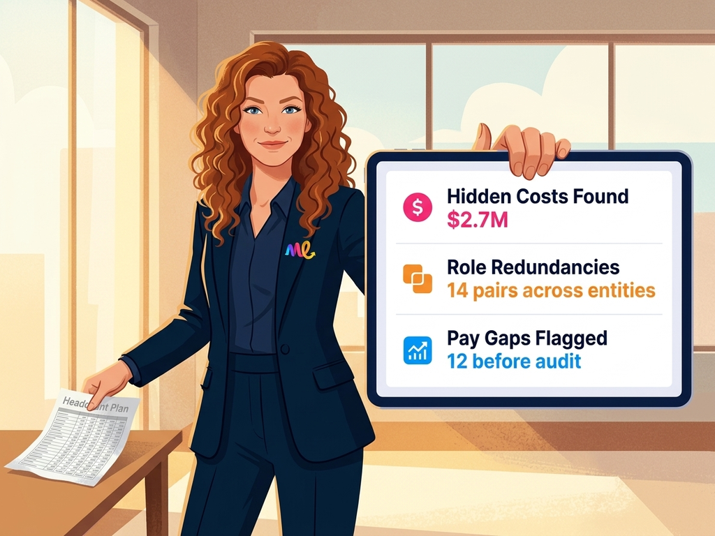 Overlapping roles across entities, pay equity gaps by gender and ethnicity, and underutilized positions are flagged with dollar values attached. Every finding comes with a cost of inaction.