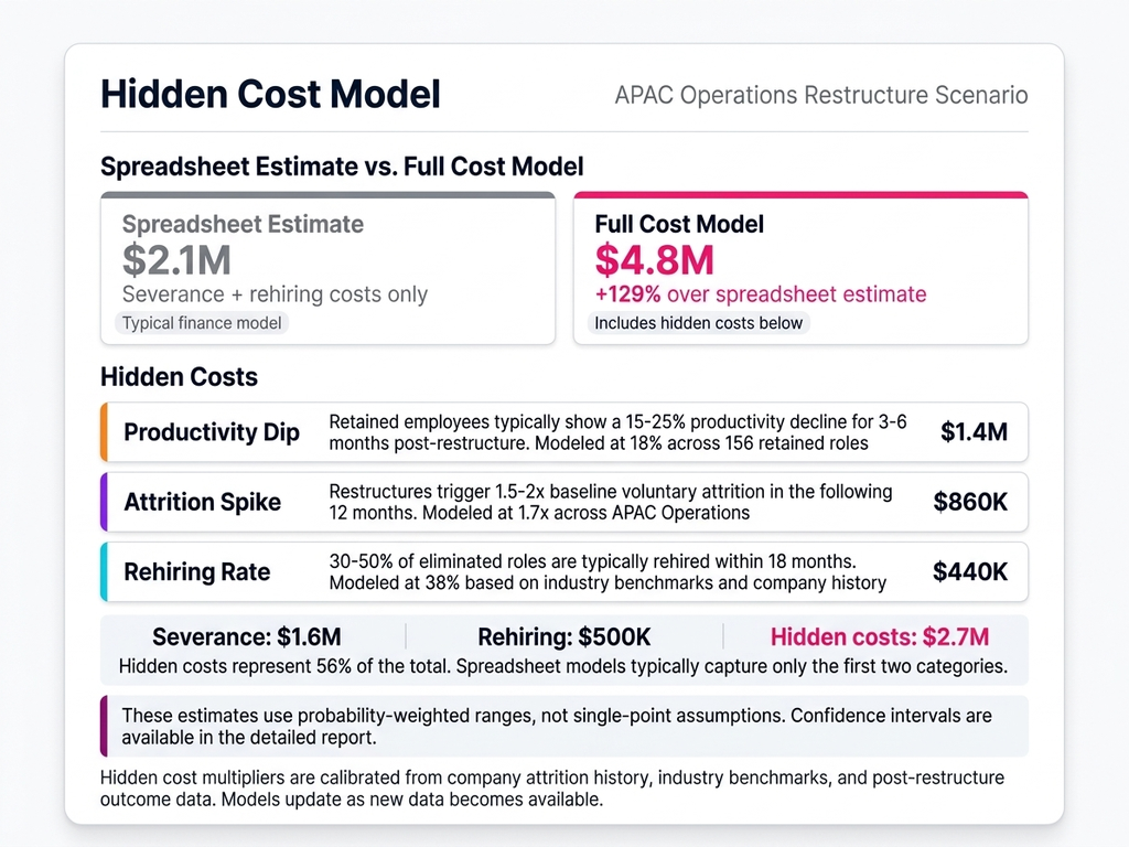 Restructurings fail 60% of the time because the business case counts salary savings and ignores everything else. The platform models severance, productivity loss, attrition spikes, and rehiring costs in one simulation.