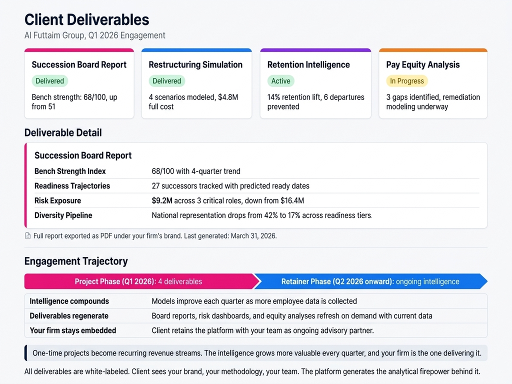 Succession planning engagements typically deliver a PowerPoint with subjective readiness labels. The platform delivers bench strength indices scored 0-100, readiness trajectories with predicted dates, single points of failure quantified in dollars, and diversity pipeline analysis. When your client's board sees data this precise, the next engagement starts before the first one ends.