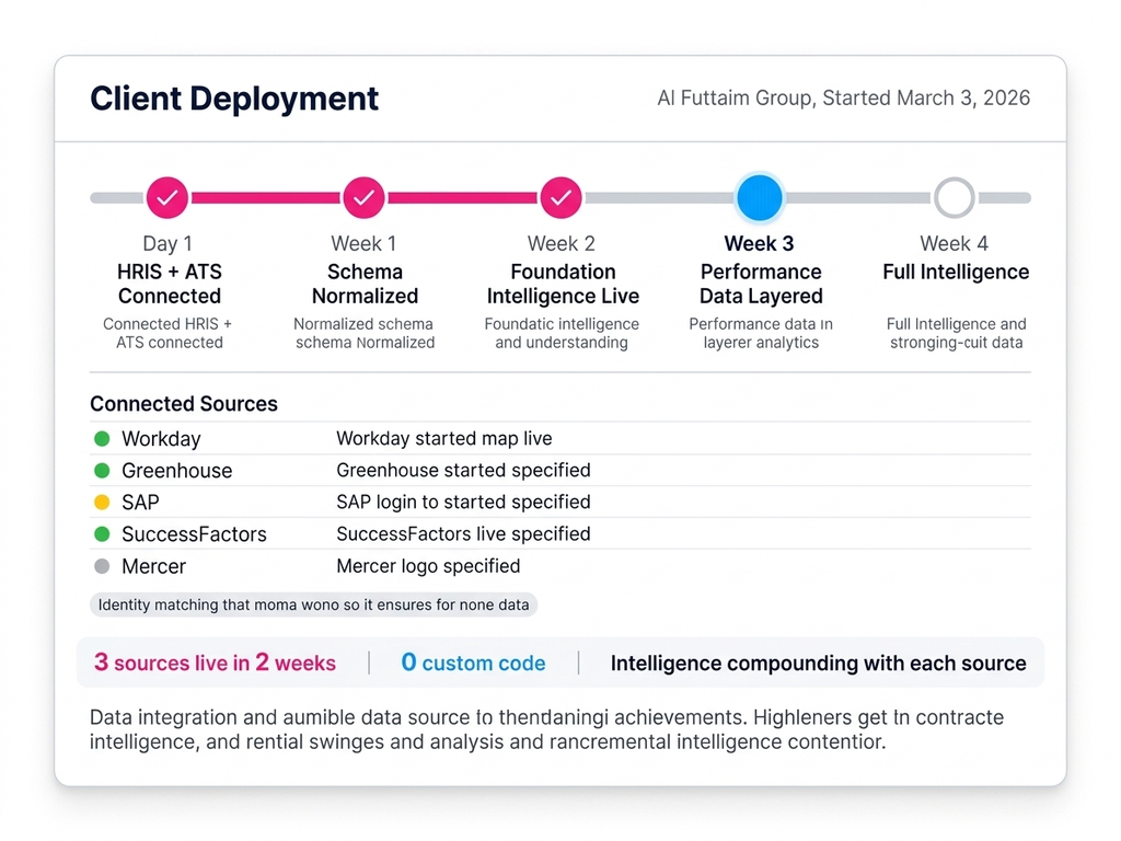 Most human capital consulting engagements spend 40-60% of their timeline on data collection, normalization, and quality control. The platform compresses that into weeks. Connect the client's HRIS and ATS first. Add performance, compensation, and engagement data as the engagement matures. Each new source sharpens intelligence across every domain without restarting the analysis.