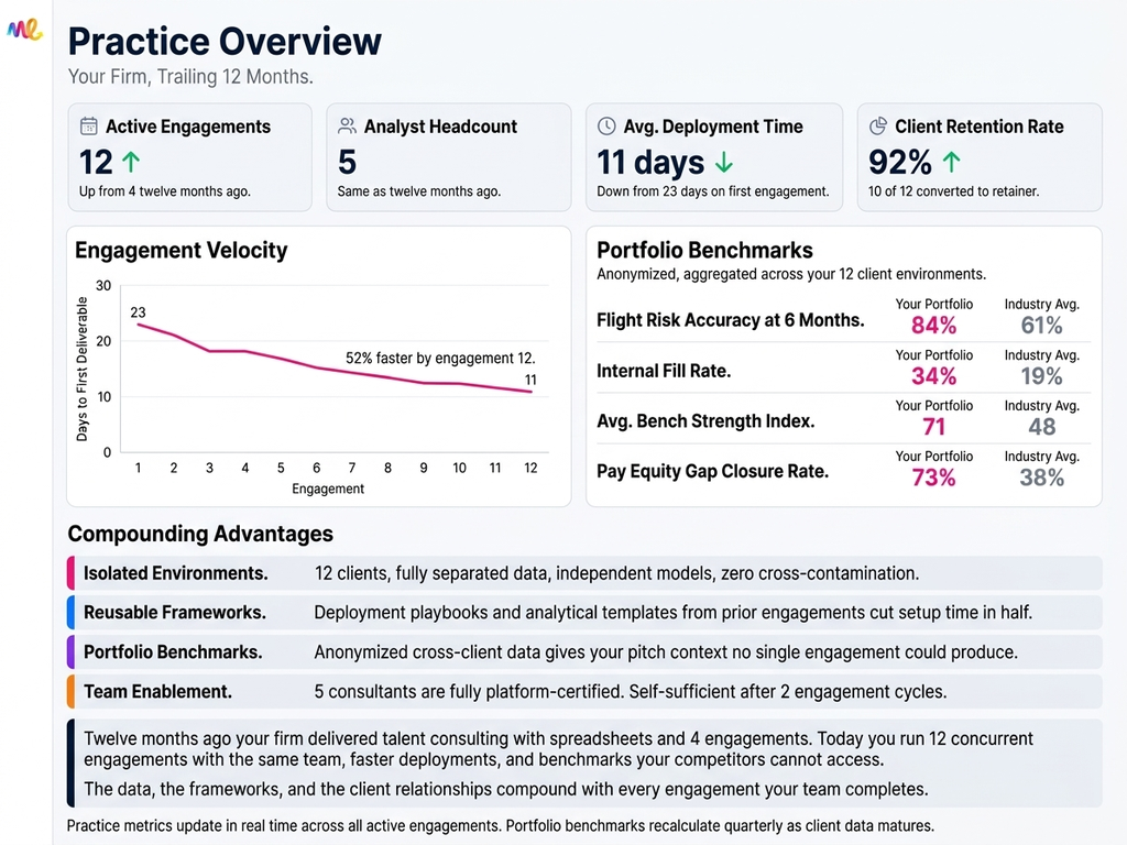 Cross-client benchmarking, anonymized and aggregated, gives your practice knowledge no single engagement could produce. You know what strong flight risk accuracy looks like at month six. You know what internal fill rates peer organizations achieve. You bring that context to every new client pitch and it shows.