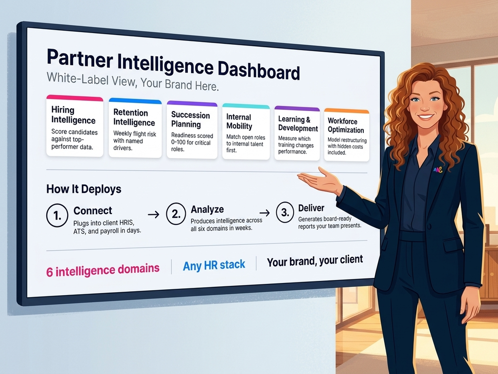 Consulting firms and agencies deploy the platform into client environments to produce talent intelligence their teams cannot build alone. Connects to any HR stack. Delivers board-ready insights in weeks.