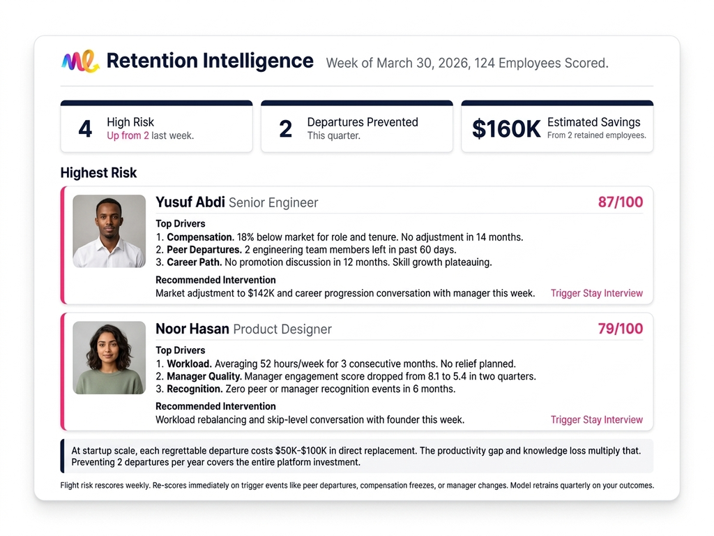 Scores every employee's flight risk weekly using compensation, engagement, and behavioral signals. Names the specific drivers behind each risk score. Delivers intervention recommendations the same week the risk surfaces.