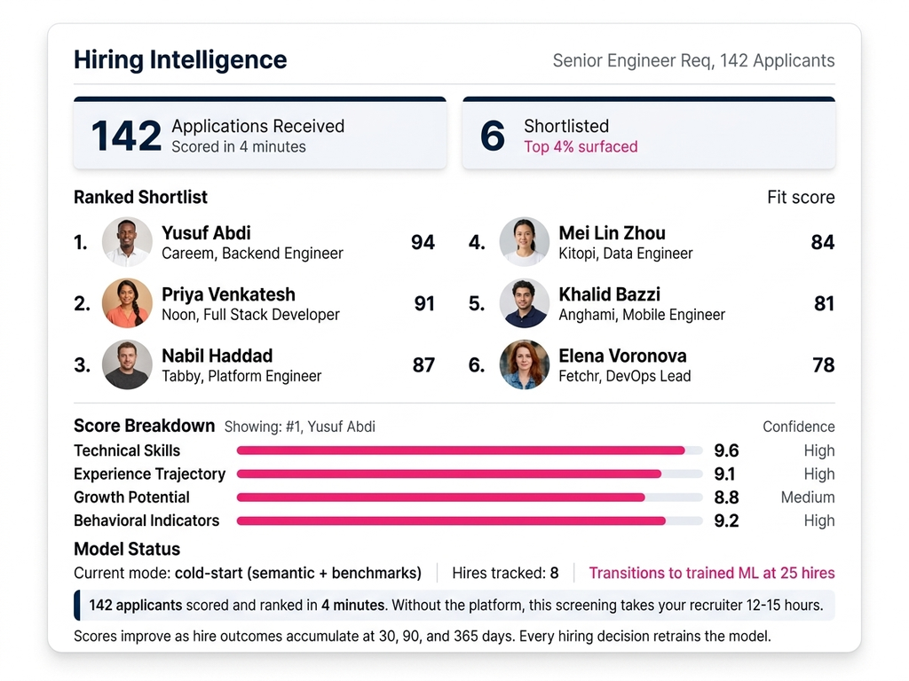 Cold-start intelligence means you do not wait months for data to accumulate. The scoring engine starts with LLM-based semantic analysis and industry benchmarks, delivering baseline fit scores from the first batch of applications. As hiring outcomes flow back at 30, 90, and 365-day milestones, the model learns what success looks like specifically at your company.