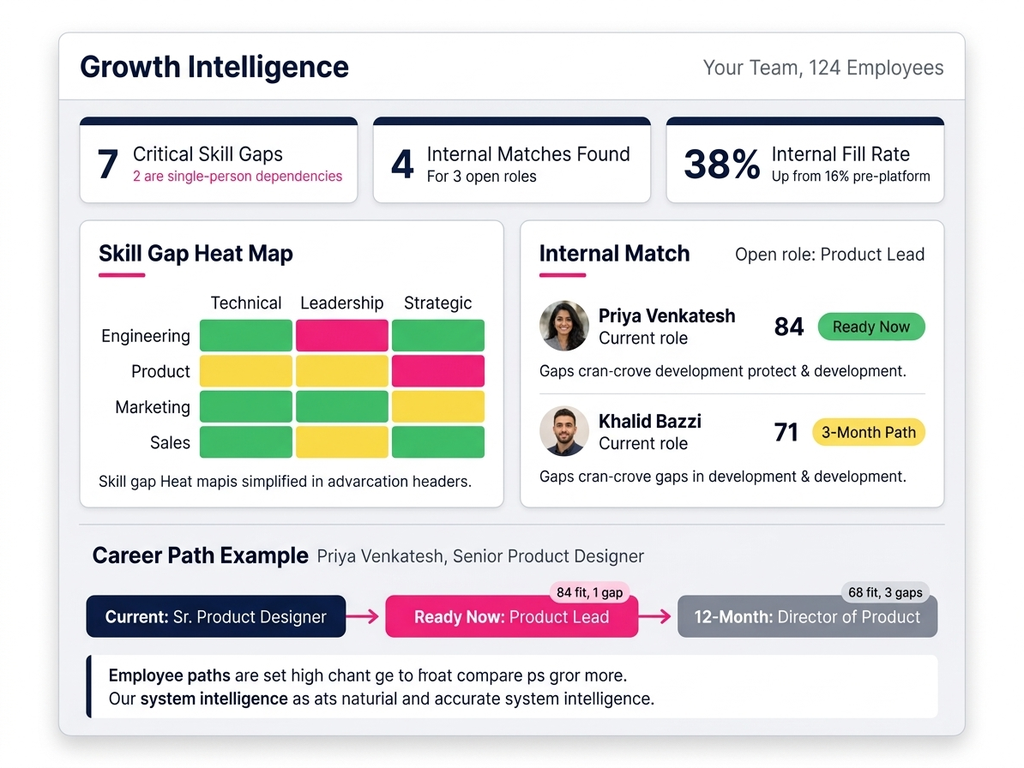 - Shows every employee concrete growth options based on actual skills and movement data. People who see a path forward stay. People who see a ceiling start interviewing.